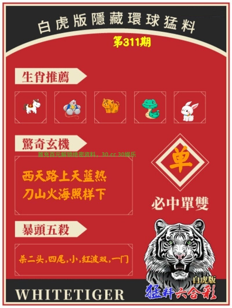 311期:白虎环球猛料 开:蛇37对 西天路上天蓝热,刀山火海照样下 解释:西天路上天蓝热,刀山火海照样下,解虎兔牛蛇 九肖:虎兔牛蛇猴猪鸡羊马 |